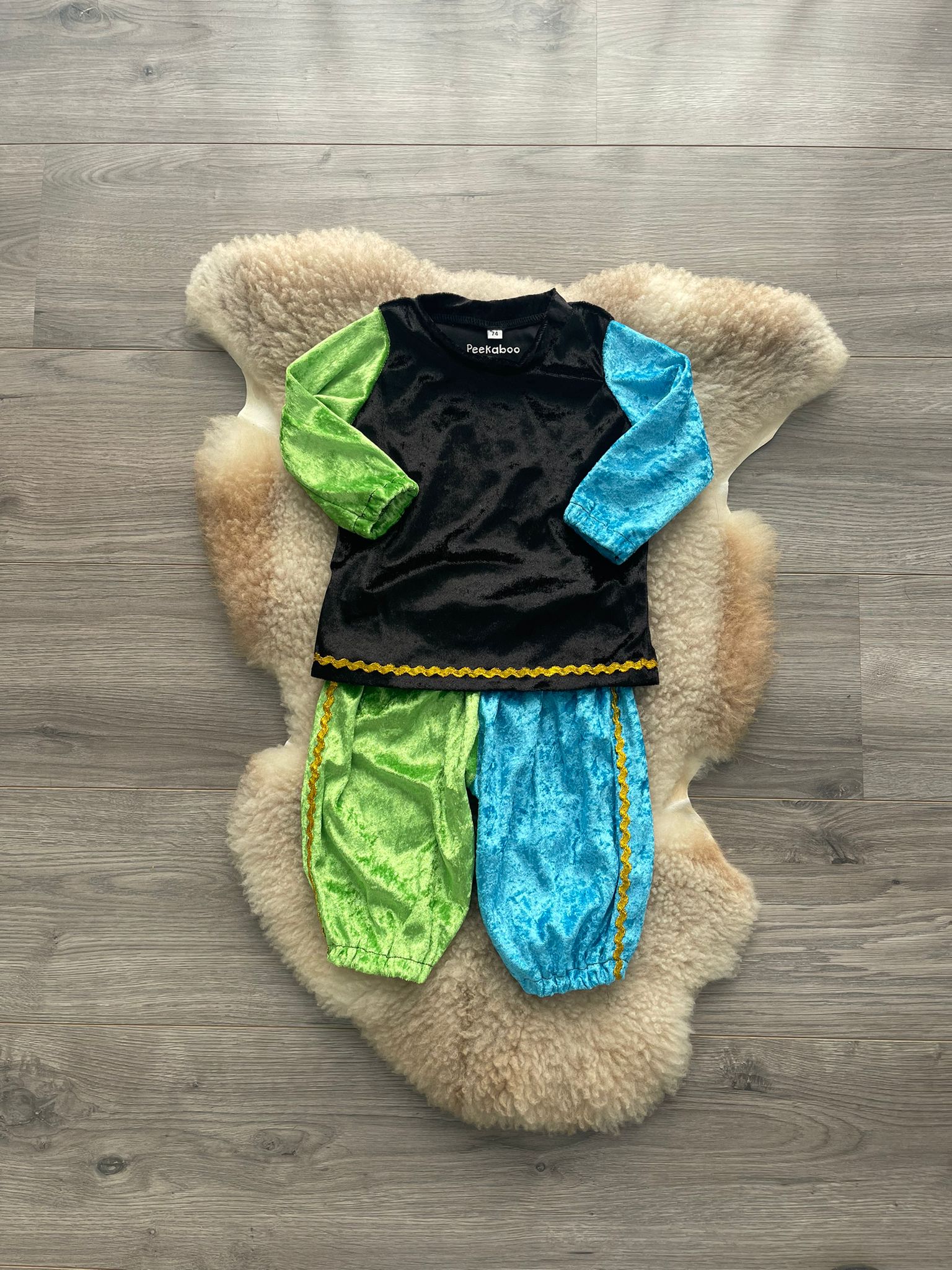 Dit leuke pietenpakje is gemaakt van velours de panne. Dit is een rekbare stof gemaakt van 100% polyester. Het pietenpakje is beschikbaar in verschillende kleuren met bijpassende muts en kraag! De broekjes zijn 3/4 lengte.